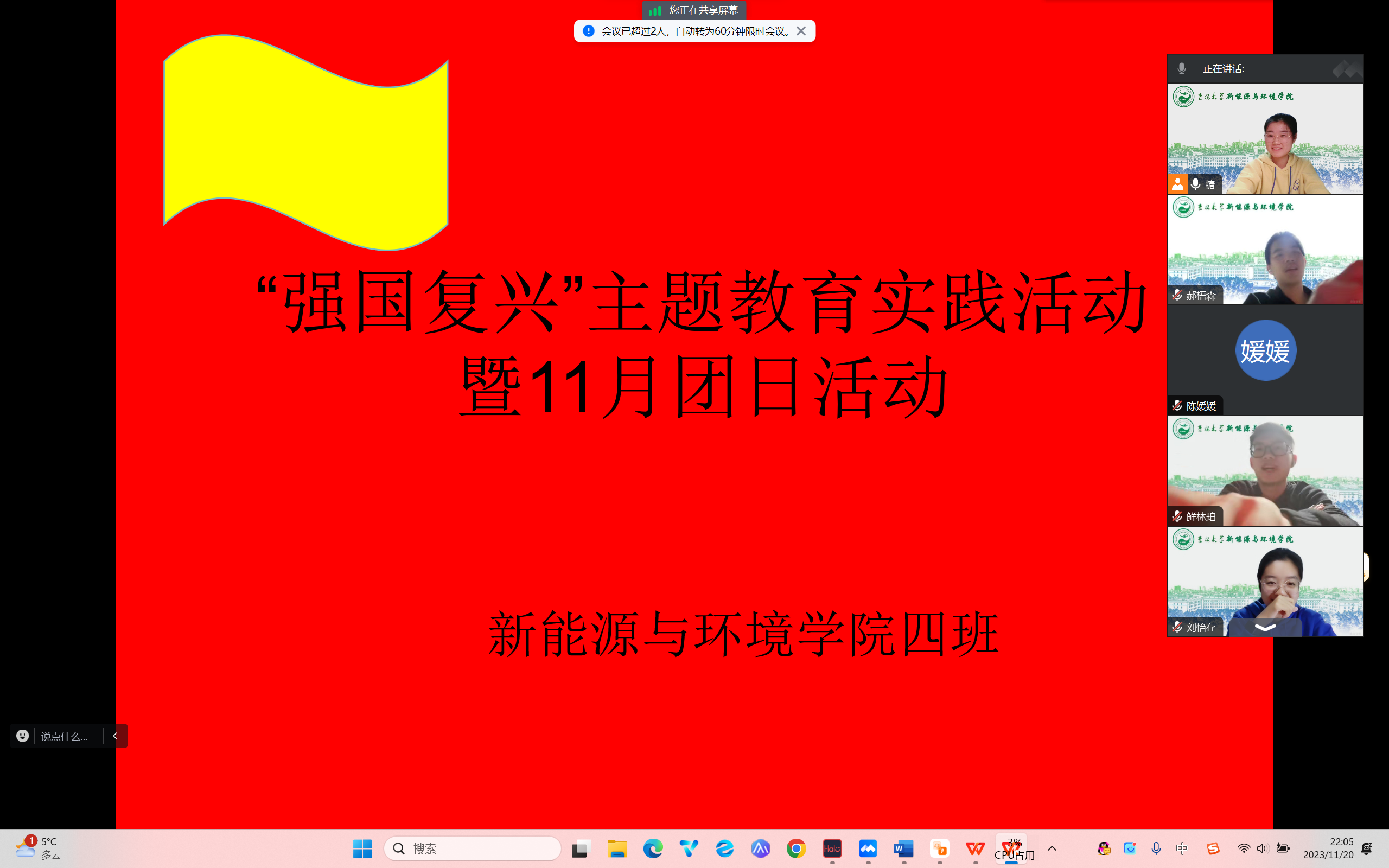 党的二十大以来,以习近平同志为核心的党中央高度重视、热情关怀青年、充分信任青年,鲜明的提出了党管青年原则,为深入学习党的二十大关于全面建成社会主义现代化强国,以中国式现代化全面推进中华民族伟大复兴战略和习近平总书记的相关重要论述。yl23455永利官网252304班团支部于十一月二十日晚六点在团支书唐烨的带领下开展“强国复兴”主题团日活动。此次活动共有包括团支部内25名共青团员在内的36位青年参加。